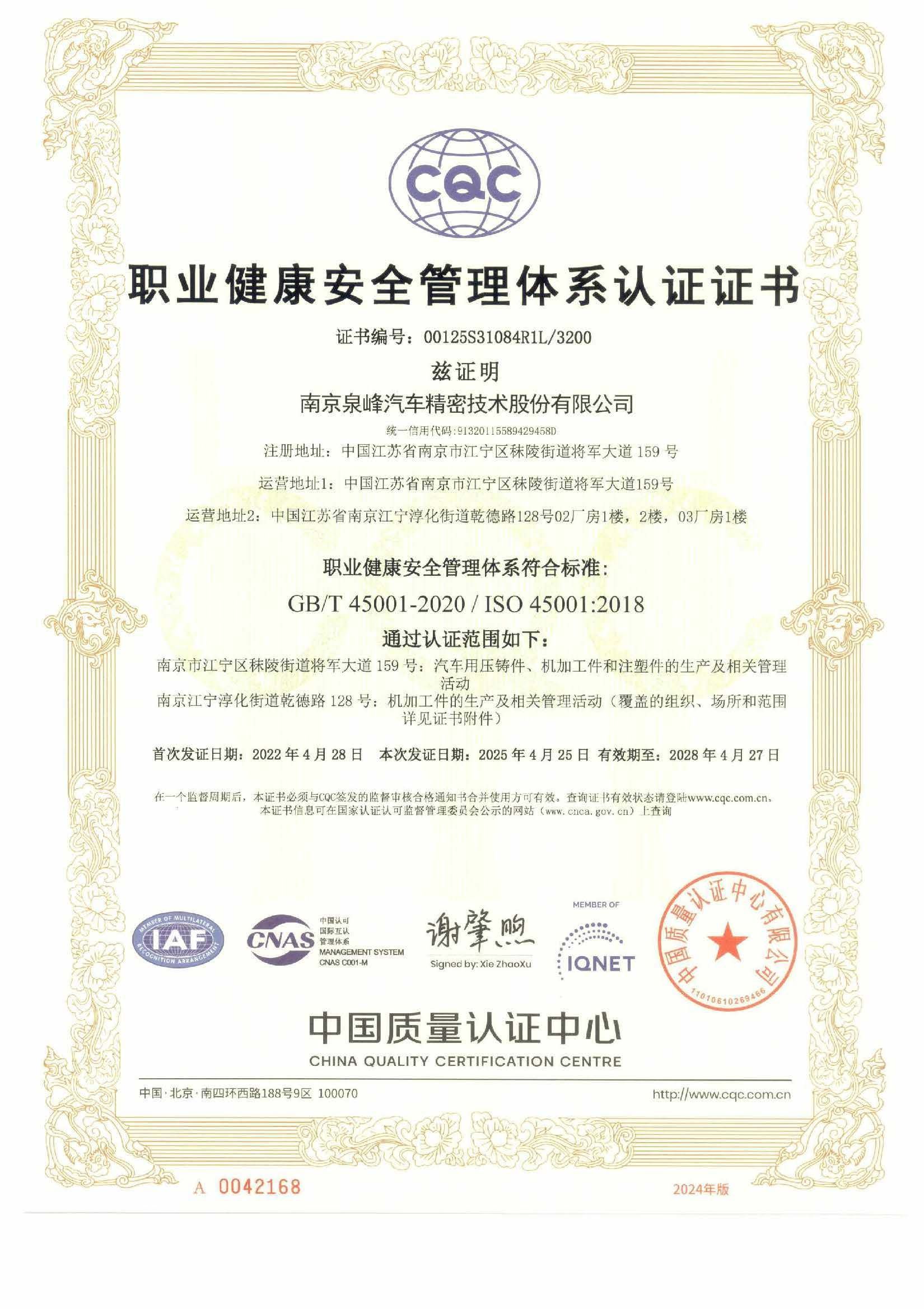 南京泉峰ISO45001證書(shū)
