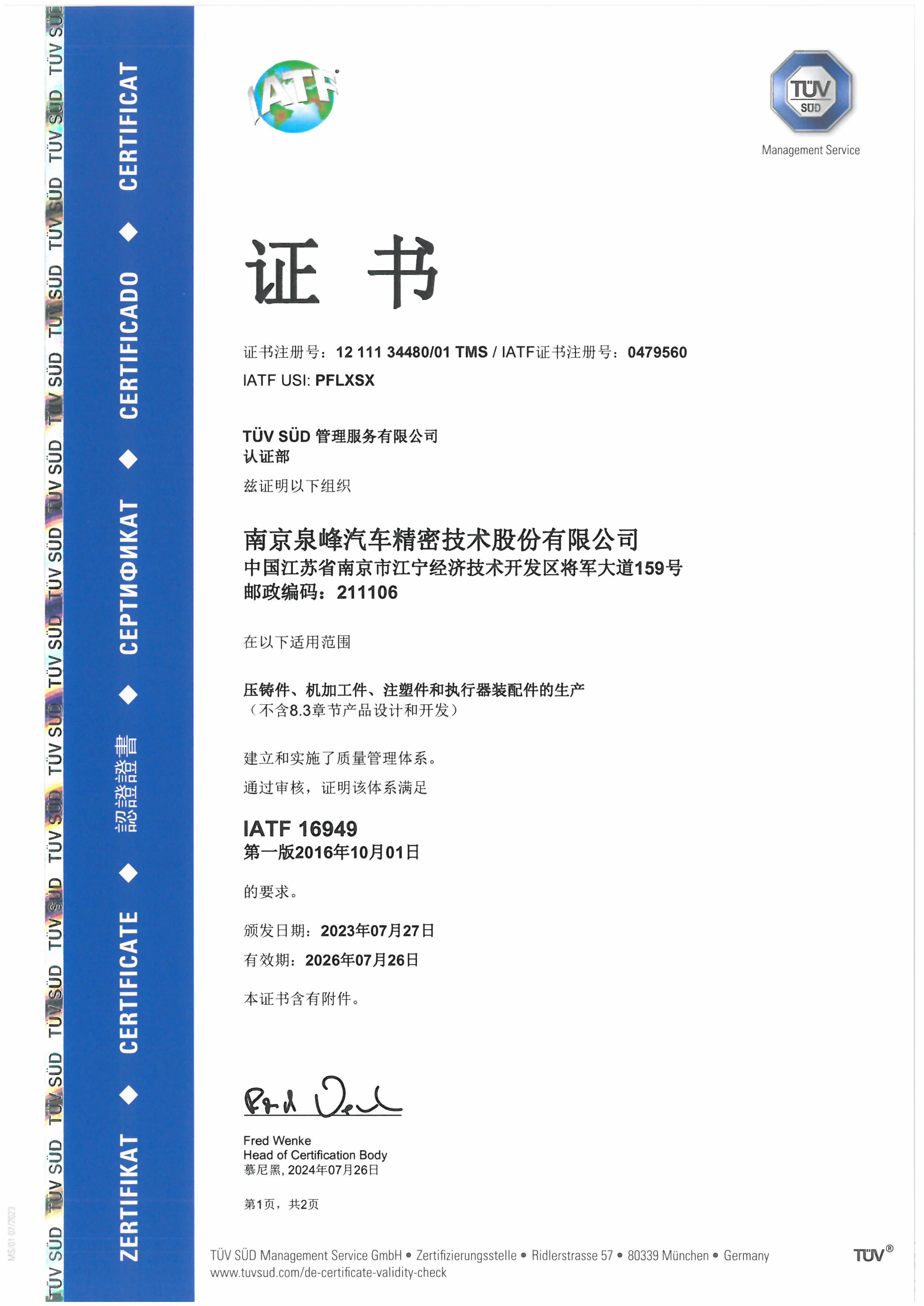 南京泉峰IATF證書(shū)